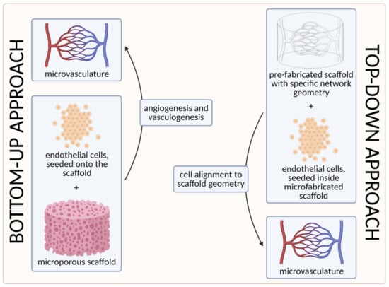 To date, two main strategies have been used to develop the microvasculature in 3D—the “bottom-up” approach and the “top-down” approach [55,100]. The approaches are compared visually in Figure 7 below.