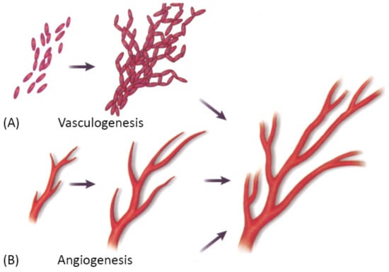 Vascularization through a bottom-up approach is achieved by two different processes—vasculogenesis, which is the de novo assembly of endothelial progenitor cells that canalize into capillaries, and angiogenesis, the sprouting of new vessels from existing blood vessels. Since these processes are relatively slow, different growth factors are used to stimulate and accelerate vessel ingrowth [3,101]. Both processes are visually represented in Figure 8 below.