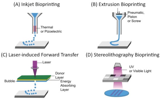General overview of common approaches to additive manufacturing of scaffolds for tissue engineering: (A) inkjet-based bioprinting, (B) extrusion-based bioprinting, (C) laser-induced forward transfer, and (D) Stereolithography bioprinting [108,110]. Reprinted (adapted) from Creative Commons Attribution License CC BY 4.0.