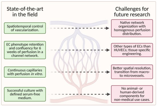 Today, vascularization stands as one of the most important challenges for creating stable, large tissues and organs in vitro. While tissue engineering and regenerative medicine have come a long way in recent decades [4,5,6], successful upscaling of tissue-engineered remains limited due to diffusion, which is insufficient for long-distance (>100–200 µm) delivery of oxygen and nutrients, as well as auxiliary functions such as waste removal and cellular communication [1,7,8]. Microvascularization is one of the unsolved challenges of vascular tissue engineering (VTE). Although it is very important for the future development of various branches of tissue engineering, this topic is currently only vaguely addressed in the available literature. Moreover, despite some interesting related research studies, to the best of our knowledge, there is no comprehensive review on this topic to date.