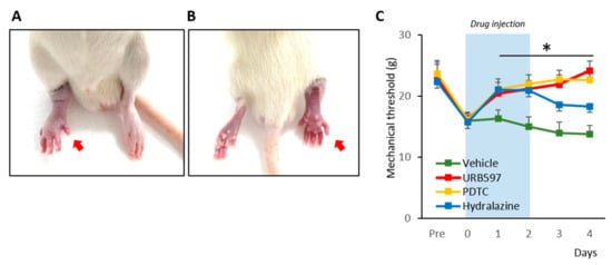 We proceeded to examine the effects of drugs (hydralazine, PDTC, and URB597) on the mechanical allodynia of CRPS rats. The nocifensive behavior changes from pre- to post-drug injection were compared for 6 consecutive days (Figure 1C). Pre-injection, randomly divided groups of rats showed similar mechanical threshold values (Pre-vehicle: 22.27 ± 2.33; Pre-URB597: 22.87 ± 2.32; Pre-PDTC: 23.65 ± 2.17; Pre-hydralazine: 22.37 ± 2.52). However, at 3 h after the induction of CPIP, each rat showed edema with reduced mechanical threshold (0 vehicle: 16.00 ± 1.20; 0 URB597: 16.32 ± 1.05; 0 PDTC: 16.15 ± 1.16 0 Hydralazine: 15.72 ± 1.42). During and after repetitive drug injections, URB597 and PDTC group rats showed significantly increased mechanical threshold values, compared to vehicle-injected rats (1 to 4 URB597: 20.47 ± 1.83, 21.19 ± 1.34, 21.93 ± 1.52, and 24.19 ± 1.56; 1 to 4 PDTC: 21.12 ± 1.68, 21.98 ± 1.48, 22.79 ± 1.42, and 22.66 ± 1.60; 1–4 vehicle: 16.29 ± 1.46, 15.05 ± 1.58, 13.96 ± 1.77, and 13.79 ± 1.42). Although, hydralazine also attenuated mechanical allodynia in CPIP model rats, its analgesic effects were reduced after discontinuing the drug (1 to 4 Hydralazine: 21.05 ± 1.41, 20.93 ± 1.42, 18.60 ± 1.39, and 18.35 ± 1.77).