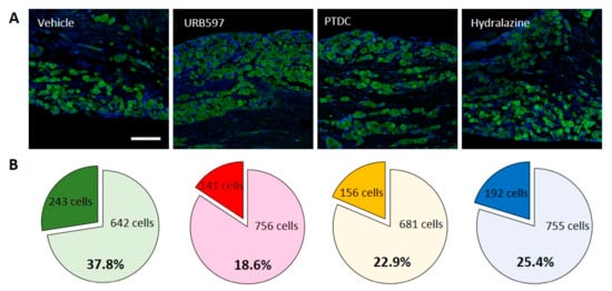 Nav1.7-expressing cells out of all neuronal cells were counted and calculated. In the vehicle group, 243/642 (Nav1.7-positive/non-positive) cells were counted. Conversely, in the URB597 group, reduced Nav1.7-positive cells were counted, compared to the vehicle group (141/756 cells). Furthermore, a similarly decreased expression of Nav1.7 was observed in PDTC and hydralazine group rats (PDTC 156/681; Hydralazine 192/755). The percentages of Nav1.7-expressing cells among DRG neurons are shown in individual pie charts (Figure 2B). More than 30% of the neurons expressed Nav1.7-positive signals after CPIP, and the expression thereof were reduced after drug treatment. These results indicated that drug treatment could modulate CPIP-induced pain.
