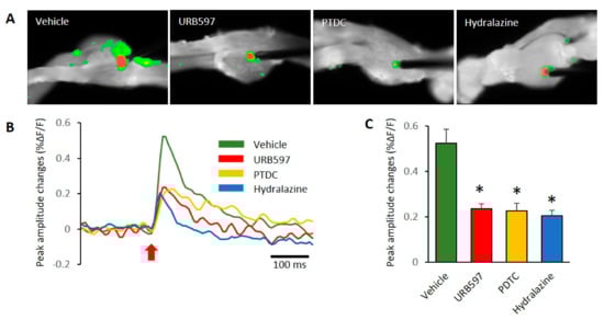 Comparison of DRG responses with electric stimulation in each group. (A) Comparison of VSD signals in the vehicle, URB597, PTDC, and hydralazine injection groups. (B) The typical time course of optical signals from DRG neurons. Red arrow represents the stimulus onset. Fluorescence changes: upward deflections of the signal indicate depolarization after electrical stimulation. (C) The reduced signals were observed in DRGs of drug-treated rats. n = 5 rats/group; one-way ANOVA followed by Tukey post hoc test was used for statistical analysis; data represent mean ± SEM; * p < 0.05.