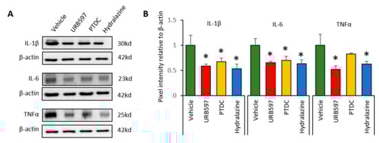 To determine whether CPIP-induced inflammation reduced after drug application, we analyzed the expression of inflammatory cytokines in DRGs at the end of the experiments. Western blot analysis was conducted to detect the expression levels of IL-1β, IL-6, and TNFα. IL-1β, IL-6, and TNFα expression in the vehicle group was greater than that in the other groups (Figure 4A). Ratios of the expression of inflammatory factors are shown in Figure 4B. Compared to vehicle groups, IL-1β expression in the URB597, PDTC, and hydralazine groups was significantly reduced (vehicle: 1 ± 0.20, URB597: 0.58 ± 0.04, PDTC: 0.67 ± 0.07, and hydralazine: 0.53 ± 0.09). Similarly, expression of IL-6 and TNFα was also showed significantly lower in the drug-treated groups (IL-6, vehicle: 1 ± 0.13, URB597: 0.65 ± 0.02, PDTC: 0.70 ± 0.08, and hydralazine: 0.63 ± 0.07; TNFα, vehicle: 1 ± 0.21, URB597: 0.52 ± 0.07, PDTC: 0.82 ± 0.02, and hydralazine: 0.62 ± 0.05). These results suggested that drug application may be reduce inflammatory responses in DRGs from CPIP rats.