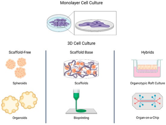Three-dimensional cell culture attempts to mimic the spatial organization of tissues. The 3D culture systems can be divided into scaffold-based, scaffold-free, and hybrids [27,28]. The scaffold-based systems use structures that mimic the extracellular matrix (ECM) composition to simulate the native cellular microenvironment. In scaffold-free systems, cells aggregate and self-assemble, as occurs in natural processes of organogenesis [29]. The hybrid systems include scaffold-base characteristics like synthetic matrix and external physical supports that confer more complex interactions between cells and ECM-cells. A clear example of these models is the organotypic raft culture and organ-on-a-chip systems incorporating microfluidic dynamics and gas exchange into simulated atmospheres with permeable membranes (Figure 1). In all 3D cell culture systems, the cells grow in a context that regulates their phenotype and function, not just as an isolated entity [30], making 3D cell culture systems more representative of what occurs in vivo compared with monolayer cultures.
