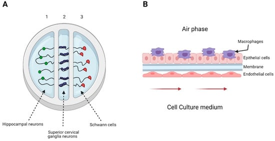 Examples of organs-on-a-chip used in viral infection studies. (A) Representation of the 3D-printed system developed by Johnson et al. The system consists of 3 chambers, seeded with hippocampal neurons in chamber 1, superior cervical ganglia neurons in chamber 2, and Schwann cells in chamber 3. They only infected chamber 2 with pseudorabies virus. (B) Representation of the alveolus model generated by Deinhardt-Emmer et al. The system consisted of a chamber divided by a porous membrane. The upper phase was seeded with a co-culture of alveolar epithelial cell and monocyte-derived macrophages and exposed to an air phase. The lower side contained endothelial cells, and the culture medium was perfused using a peristaltic pump.
