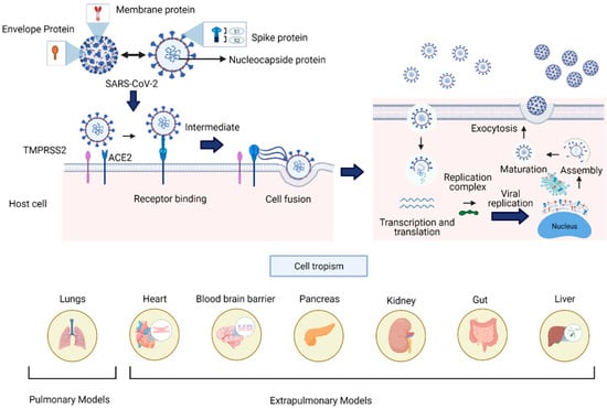 SARS-CoV-2 viral structure, infective cycle, and cell tropism. The structural proteins of SARS-CoV-2 comprise the S (spike), N (nucleocapsid), M (membrane), and E (envelop) proteins. For viral entry into the host cell, the spike protein interacts with the ACE2 and TMPRRS2 enzymes widely distributed in several human tissues. The infective cycle of SARS-CoV2 includes endocytosis mediated by the viral spike protein–ACE2 cell interaction. Once entering the cell, replicating and forming virions is achieved by the assembly and maturation of new viral particles and subsequent exocytosis. The lower panel shows the target organs previously developed to simulate viral infection processes. These 3D cell cultures resemble in vitro aspects of human pathophysiology, which are crucial to understand and address the current pandemic.