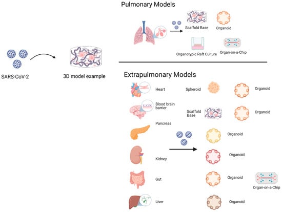 The 3D cell culture pulmonary models include scaffold-base, organoids, organotypic raft culture, and organ-on-a-chip. The objective is to emulate viral tropism, infective cycle, and replication process. Instead, 3D cell culture extrapulmonary models have been evaluated in organoids and organ-on-a-chip, except for the blood–brain barrier, which only includes scaffold-base models. The gut-on-a-chip model includes a few of the 3D cell culture models where therapeutic drugs like remdesivir are evaluated.