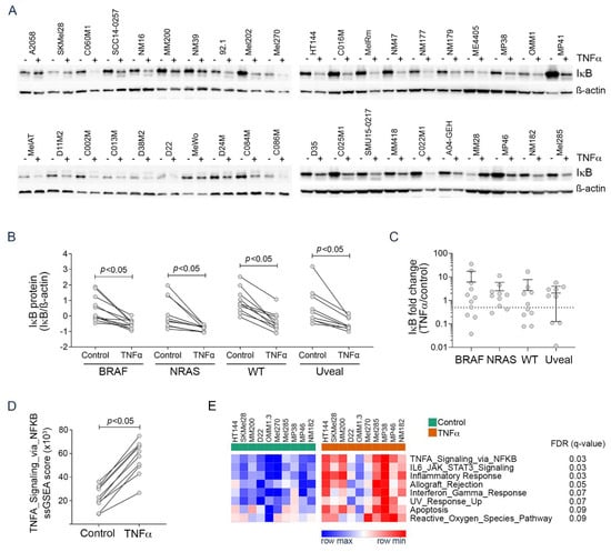 TNFα responses in cutaneous and uveal melanoma cell lines. (A) Western blots of melanoma cell lysates showing IκB expression 72 h after treatment with BSA control (-) or 1000 U/mL TNFα (+). (B) Densitometric quantitation of IκB expression (normalized to ß-actin and converted to z-scores to enable analysis of independent experiments) after treatment with BSA control or TNFα in BRAF-mutant, NRAS-mutant and wildtype (WT) cutaneous and uveal melanomas. Each dot represents the average of three independent experiments for each cell line. Significant comparisons between control and TNFα were determined by paired t test and indicated by p < 0.05. (C) Fold change in IκB expression (TNFα/control z-scores after ß-actin normalization). Each dot represents the average of three independent experiments for each cell line. Results are the average ± SD in each group and significant comparisons between groups determined by one-way ANOVA and Tukey’s multiple comparisons test. (D) Single sample gene set enrichment analysis (ssGSEA) scores for the Hallmark_TNFA_Signaling_via_NFKB in 10 melanoma cell lines (HT144, SKMel28, MM200, D22, NM182, MEL270, MP38, MP46, OMM1.3, MEL285) after BSA control or TNFα exposure. Comparisons between control and TNFα determined by paired t test and indicated by p < 0.05. (E) Heatmap showing differentially expressed Hallmark transcriptome gene sets between melanoma cell lines treated with BSA control or 1000 U/mL TNFα for 24 h. Differences were determined using a t test and significant signatures selected based on a false discovery rate (FDR) q < 0.10.