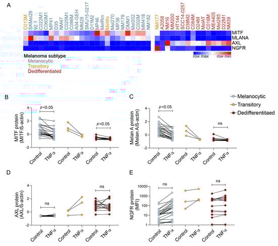 Expression of melanoma dedifferentiation markers in response to TNFα in 40 melanoma cell lines. (A) Heatmap showing the densitometric quantitation of MITF, Melan A and AXL (normalized to ß-actin and converted to z-scores), and geometric mean fluorescence intensity (MFI) values for NGFR in melanocytic (blue), transitory (orange) and dedifferentiated (red) melanoma cells at baseline (BSA control). The differentiation states of the melanoma cell lines were classified based on the mean z-scores of MITF, Melan A and AXL and the MFI for NGFR from three independent experiments. Relative expression of (B) MITF, (C) Melan A, and (D) AXL based on densitometric values, and (E) NGFR based on MFI values, 72 h after treatment with BSA control or TNFα. Each dot represents the average of three independent experiments for each cell line. Significant comparisons between groups were determined by paired t test and indicated by p < 0.05, ns; not significant.