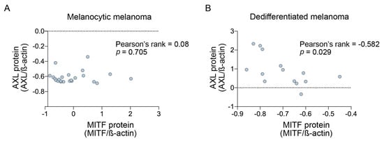Correlation of melanoma dedifferentiation markers in melanocytic and dedifferentiated melanomas. Scatterplots showing correlation of AXL and MITF protein (normalized to ß-actin and converted to z-scores) in (A) melanocytic (n = 23) and (B) dedifferentiated (n = 14) melanoma cell lines. Correlation calculated using Pearson’s rank correlation coefficient, p < 0.05.