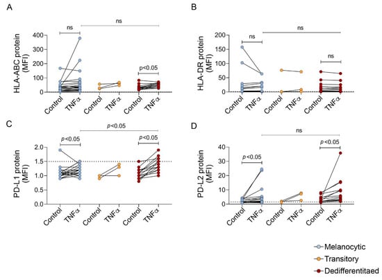 Induction of immune effector molecules by TNFα. Cell surface expression of (A) HLA-ABC, (B) HLA-DR, (C) PD-L1 and (D) PD-L2 (shown as relative mean fluorescence intensity (MFI)) 72 h after BSA control or TNFα treatment in melanocytic, transitory and neural crest-like dedifferentiated melanoma cell lines. Each dot represents one cell line and results are the average of at least three independent experiments. Dotted line shows a cutoff for positivity set at MFI = 1.5. Significant comparisons between groups were determined by paired (control vs. TNFα) or unpaired (TNFα vs. TNFα) t test and indicated by p < 0.05, ns; not significant.