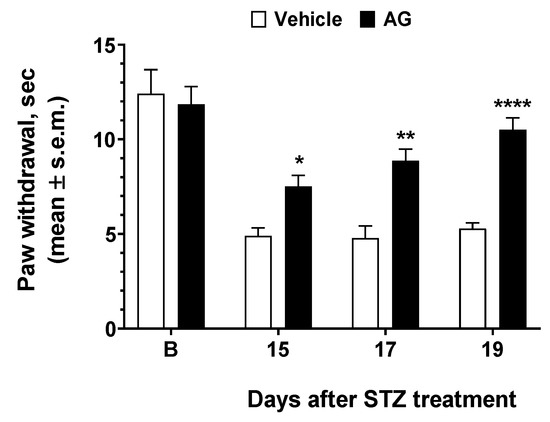 Effects induced by AG in Streptozotocin-induced diabetic mice. Paw withdrawal latency was recorded before STZ treatment (baseline latency, B) and three more times at 15, 17, and 19 thereafter. Vehicle (V, saline 10 mL/kg) and AG (50 mg/kg, 10 mL/kg) were administered three times at day 15, 17, and 19 after STZ injection. * is for p < 0.05, ** is for p < 0.01, and **** is for p < 0.001 vs V. n = 9.