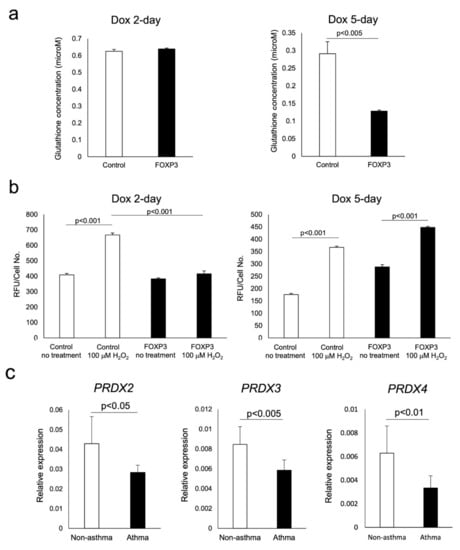 Jurkat cells inducibly overexpressing FOXP3 for 2 days (FOXP3 2-day cells) are similar to CD4+CD25+CD127−/low T cells from subjects without asthma and FOXP3 5-day cells are similar to Tregs from asthmatic subjects. Sensitivity to oxidative stress was evaluated by H2O2-induced caspase activity, intracellular glutathione content, and microarray analysis. The glutathione content of FOXP3 2-day cells was similar to that measured in control cells; however, it was decreased in FOXP3 5-day cells (Figure 4a). H2O2-induced caspase activation in FOXP3 2-day cells was lesser than that observed in control cells treated with H2O2; however, caspase activation in FOXP3 5-day cells was restored to the level measured in control cells (Figure 4b). Microarray analysis revealed that peroxiredoxin (PRDX)-2, -3, and -4 were among the antioxidant genes that were increased distinctly in FOXP3 2-day cells, but not in control or FOXP3 5-day cells (Table 2). The results obtained by microarray were confirmed by measurement of the mRNA expression of these three genes in Treg cells isolated from peripheral blood of adult subjects with or without asthma (Figure 4c).