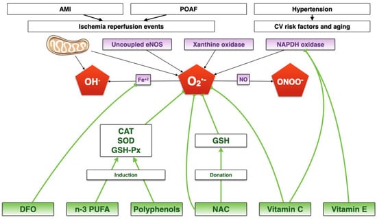 Integrative summary of how oxidative stress could be an underlying mechanism for postoperative atrial fibrillation, acute myocardial infarction, and hypertension. There are four main ROS sources, producing mainly superoxide anion. ROS production can be amplified through the interaction with nitric oxide and iron, to produce peroxynitrite and hydroxyl radical, respectively. CV: Cardiovascular. AMI: Acute myocardial infarction. NO: Nitric oxide. Fe+3: Free ferric iron. OH: Hydroxyl anion. CAT: Catalase. GSH-Px: Gluthathione peroxidase. SOD: Superoxide dismutase. n-3 PUFA: Polyunsatured fatty acids. DFO: Deferoxamine. NAC: N-acetylcysteine. GSH: Glutathione. POAF: Postoperative atrial fibrillation. ONOO-: Peroxynitrite. OH•: Hydroxyl radical. O2•-: superoxide anion. eNOS: Endothelial nitric oxide synthase.