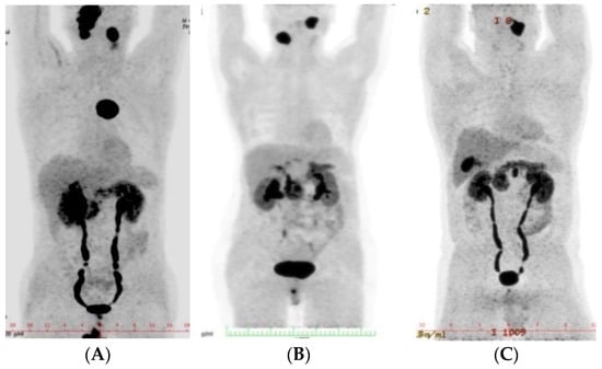 Figure 1. Whole body imaging using 18F-FDOPA PET-CT demonstrating multifocal paragangliomas in (A) patient no. 2, (B) patient no. 3 and (C) patient no. 4.