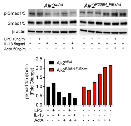 To determine whether TLR or IL1R1 signaling enhances ActA/Alk2R206H signaling, phosphorylation of Smad1/5 was measured in murine Alk2w/w and Alk2R206H_FlEx/w FAPs treated with ActA alone or in combination with LPS or IL-1β (Figure 1). As expected, treatment of serum starved FAPs with LPS or IL-1β did not alter pSmad1/5, regardless of Alk2R206H expression. In Alk2w/w FAPs, ActA decreased endogenous pSmad1/5, regardless of costimulation with LPS or IL-1β. However, in Alk2R206H/w FAPs, ActA increased pSmad1/5, which was further enhanced by cotreatment with LPS or IL-1β (Figure 1). This confirms that ligands which activate MyD88-dependent signaling pathways can enhance aberrant ActA/Alk2R206H-induced pSmad1/5 in a manner similar to that reported for BMP-induced signaling in Alk2wt cells [27,28,29,30] and cells from FOP patients [31].