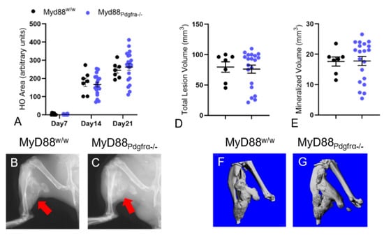 Conditional deletion of MyD88 in PDGFRα+ cells in Acvr1R206H_FlEx/wt mice did not affect muscle injury-induced EHO area and volume. (A) Semiquantification of intramuscular HO area in radiographs and (D,E) μCT-based quantification of HO volume demonstrated unaffected HO area (A), total lesion volume (D), and mineralized volume (E) in Acvr1R206H_FlEx;MyD88Pdgfrα−/− vs. Acvr1R206H_FlEx;MyD88w/w mice. Representative radiographs (B,C) and μCT reconstructions (F,G) of representative samples at 21 dpi illustrating extensive EHO (red arrows) in both genotypes. Statistical significance was tested using Kruskal–Wallis test or a two-tailed unpaired Student’s t-test. No significant differences were found.