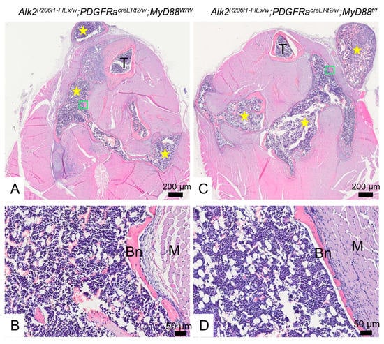 Following the microCT scanning, the maturity and composition of the EHO lesions was examined histologically in H&E-stained sections. In Acvr1R206H_FlEx;Myd88w/w mice, EHO lesions had transitioned from cartilage to ossicles of thin lamellar bone surrounding bone marrow, with few or no trabeculae (Figure 3A,B), as is typical in this model. Careful examination of similar sections from Acvr1R206H_FlEx;Myd88Pdgfrα-/- mice (Figure 3C,D) did not reveal any gross differences in the maturity, structure, or composition of the EHO compared to the Acvr1R206H_FlEx;Myd88w/w mice. While a detailed analysis might still find minor differences in ossicle remodeling or marrow composition, these gross observations demonstrate that deletion of MyD88 in Pdgfrα-positive cells did not impair maturation of the EHO in this model.