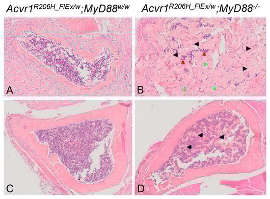Representative H&E-stained sections of intramuscular EHO lesions and host tibias in Acvr1R206H_FlEx;Myd88w/w and Acvr1R206H_FlEx;Myd88−/− FOP mice 21 dpi. Images are representative micrographs of intramuscular EHO lesions (A,B) and host tibias (C,D) in the same sections of decalcified paraffin embedded sections stained with H&E. (A) A typical mature ossicle of EHO in the hindlimb muscle of an Acvr1R206H_FlEx;Myd88w/w mouse. While most EHO ossicles in Acvr1R206H_FlEx;Myd88−/− mice were similar to that shown in panel A, some ossicles in Acvr1R206H_FlEx;Myd88−/− mice exhibited a disorganized structure (B). Note the striking differences in bone organization and soft tissue composition inside the ossicles, including the presence of dysplastic immature immune cells (red arrow heads), excessive erythropoiesis (black arrows), and areas of extracellular matrix accumulation (green stars). (C,D)—Lox magnification images of tibiae adjacent to the lesions in (A,B), illustrating bone marrow composition similar to that of the respective EHO.