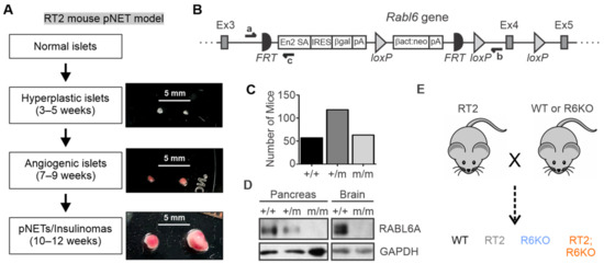 We recently identified a new potential driver of pNETs, a RAB-like GTPase named RABL6A. The protein was first discovered as a novel binding partner of the Alternative Reading Frame (ARF; p14ARF in humans, p19ARF in mice) tumor suppressor [6]. Later studies showed RABL6A is essential for the growth and survival of various tumor types, controls central cancer pathways (RB1, p53, PP2A, AKT, mTOR, ERK), and is a biomarker of poor survival in several cancers including breast and pancreatic adenocarcinomas [7,8,9,10,11,12,13,14,15]. In pNETs, RABL6A is highly expressed at the genetic and protein levels in human primary and metastatic tumors [10,16]. Functional studies in cultured pNETs revealed RABL6A is required for pNET cell proliferation and viability [10,12]. Moreover, RABL6A acts through several clinically relevant pNET pathways. This includes inhibition of the retinoblastoma (RB1) and protein phosphatases 2A (PP2A) tumor suppressors and activation of oncogenic AKT and mTOR [10,12]. Considered together, the in vitro analyses of RABL6A activity in cultured pNETs suggest it would promote pNET pathogenesis in vivo.