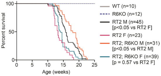 RT2 mice have a short life expectancy due to excessive insulin secretion from the pNETs that induces hypoglycemic shock and death [21]. We monitored the survival of male and female mice within all four experimental cohorts to determine if RABL6A loss improves survival in RT2 mice. All WT and R6KO mice of both sexes were alive throughout the entire observation period. A significant difference was seen in the survival of RT2 females (median 13.3 weeks) versus RT2 males (median 15.7 weeks) (Figure 2), an observation that we could not find noted in prior reports where the sex of the animals was often not stated. As hypothesized, loss of RABL6A significantly increased the survival of RT2; R6KO males (median 18.0 weeks). A modest increase in the median survival of RT2; R6KO females (14.1 weeks) was seen relative to that of RT2 females (13.3 weeks), but the difference was not statistically significant (Figure 2; Table 1). After adjusting for sex, an overall difference in survival was evidenced between RT2 and RT2; R6KO mice with RT2 mice being at 59% increased risk of death (HR = 1.59, p < 0.05).