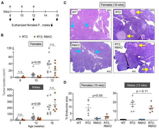 Given the sex-dependent differences in overall survival for RT2 and RT2; R6KO mice, we evaluated the development and progression of tumors according to different timelines for male and female animals. Female cohorts were euthanized for histopathologic and molecular analysis at 8, 10, and 12 weeks of age whereas males were euthanized at 8, 12, and 16 weeks of age (Figure 3A). At each time point, pancreatic islets and tumors were isolated via pancreatic perfusion or the whole pancreas was excised for fixation and histopathology.