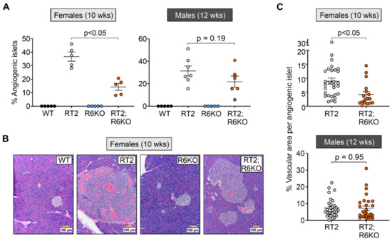 The following are available online at https://www.mdpi.com/article/10.3390/biomedicines9060633/s1, Figure S1: Genotyping RIP-Tag2 (RT2) and R6KO mice, Figure S2: Graphs depicting plasma insulin concentration in female (6–13 weeks) and male (6–16 weeks) experimental mice, Figure S3: Percent endocrine area in the pancreata of female (left) and male (right) experimental mice at the indicated ages. 8-week-old RT2, Figure S4: Scatterplots showing the percentage of angiogenic islets per pancreas (top row) or percent vascular area per angiogenic islet (bottom row) in female (left) and male (right) mice of the indicated genotypes, Figure S5: Scatterplots depicting the average number of mitoses per field of vision at 600× magnification for individual female (left) and male (right) pancreatic islets, Figure S6: Comparison of relative Vegfa and Arf transcript levels in WT vs R6KO and RT2 vs RT2; R6KO islets isolated from age-matched male and female mice.