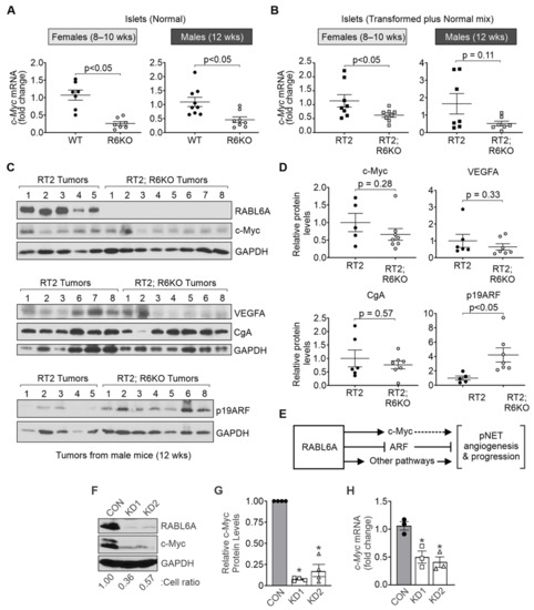 VEGFA is a known pro-angiogenic gene in pNETs that is transactivated by c-Myc [18,23,35]. qRT-PCR and western blot analyses were performed to test whether RABL6A upregulates VEGFA expression in WT-normal and RT2-transformed islets. We found that RABL6A promotes Vegfa transcription in the normal islets of WT male and female mice, but this was not seen in the transformed islets of RT2 mice (Supplementary Figure S6A,B). Likewise, western analyses of isolated pNETs showed no significant difference in VEGFA protein levels between 12-week-old RT2 and RT2; R6KO males although a modest decrease in the mean value was observed in the RABL6A-deficient tumors (Figure 6C; Table 1). Immunoblotting for the neuroendocrine specific differentiation marker, chromogranin A (CgA), verified retention of pNET identity in tumors lacking RABL6A (Figure 6C,D).
