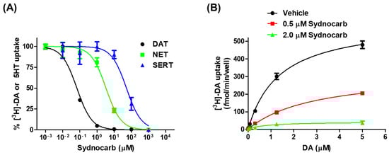 Transiently transfected COS-7 cells (expressing hDAT, hNET, or hSERT) were plated in 96-well plates. Uptake experiments were performed 2 days later. The media was removed, and the cells were washed with PBS-CM. Following washing, the cells were incubated for 10 min with various concentrations of sydnocarb, and the uptake was initiated by adding [3H]-dopamine to a final concentration of 25 nM. The uptake was allowed to continue for 10 min at room temperature and was terminated by washing twice with PBS-CM. The cells were solubilized in a scintillation cocktail and counted on a microplate scintillation and luminescence counter (PerkinElmer, Waltham, MA, USA). Data were fitted to a Hill equation by a nonlinear regression analysis to obtain the IC50 values.