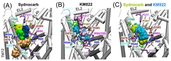 Our previous MD simulations of wild-type hDAT, starting from the OFo conformer, showed that the binding of DA and ions triggered the closure of the EC gates (R85-D476 and Y156-F320) within 60 ± 30 ns to allosterically drive the transition of the transporter to the OF closed (OFc) state, followed by a state occluded to both the EC and IC environments [20,38,45]. In contrast, in the case of sydnocarb, the two EC gates R85-D476 and Y156-F320 remained open in the majority of the simulations (see Figure 3 and Figure S3D,H). These findings further suggest that the binding of sydnocarb arrests DAT in the OF open state. Similar observations were made in the docking simulations of KM822 onto the OFo hDAT conformation using the GOLD docking software, while the docking of KM822 onto the IFo hDAT conformation resulted in sterically unfavorable interactions [30]. In order to better visualize the multiple binding sites and poses that we observed for both KM822 and sydnocarb in our docking and MD simulations, we next examined the residues contributing to the binding of KM822 or sydnocarb within each site (Figure 4). Interestingly, the two sites broadly agree with the multiple allosteric (S2)-binding sites reported in the literature [10]. Both the Run1-Site and the A2 site share contacts with the crystal structure-resolved allosteric-binding site of (S)-citalopram bound to hSERT (PDB: 5I73) [13] and agreed with the sites observed for the same drug, (S)-citalopram, in the simulations and biochemical experiments [46].