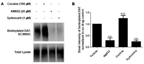 To experimentally characterize and to confirm whether sydnocarb binds to the allosteric region of hDAT similar to that of KM822, we employed the substituted cysteine scanning mutagenesis (SCAM) method (Figure 5). We previously used this method to successfully validate the in silico-predicted binding site of KM822 to provide experimental evidence of its location and structural determinants [30]. In SCAM studies for KM822, several DAT mutants were created in which the amino acids lining the proposed allosteric pocket were systematically replaced by cysteine via site-directed mutagenesis. The only cysteine in the native DAT that was accessible from the EC environment (C306) was replaced with an alanine to create a biotinylation insensitive mutant, and this mutant (DAT-XC) was used to generate all the mutants. Then, the MTSEA-biotin reagent was used to assess the accessibility and reactivity of the thiol (-SH) group of the introduced cysteine in the absence or presence of KM822. Following biotinylation, biotinylated DAT was affinity-purified using streptavidin beads, separated, and detected using immunoblotting employing an antibody against an HA-tag that was incorporated N-terminally in all the DAT constructs. In our previous results, KM822 was consistently found to significantly protect the biotinylation of one of the mutants, W84C, which strongly suggested the proximity of KM822 with the W84 residue within the binding pocket, as seen in the current and previous computational modeling experiments. To confirm experimentally whether sydnocarb also binds to the same allosteric domain as KM822, we tested the biotinylation of the W84C mutant in the absence or presence of 1-µM sydnocarb. We observed that the biotinylation of W84C was significantly decreased by sydnocarb coincubation (Figure 5). This indicated that sydnocarb most likely binds in the vicinity of W84 similar to KM822, suggesting that sydnocarb and KM822-binding pockets overlap with each other. We used cocaine as the negative control in these experiments and observed that the labeling of W84C with MTSEA-biotin was not affected by the coincubation of 100-μM cocaine, suggesting W84 was not part of the orthosteric S1 site. This further indicated that sydnocarb and cocaine were bound at distinct binding sites within the transporter. These results provided a strong experimental validation of our MD simulations. Another possible explanation for this observation could be that the protection of the W84C residue occurred due to a long range of conformational changes caused by sydnocarb binding elsewhere. However, our modeling and experimental evidences together presented a compelling proof of direct binding.