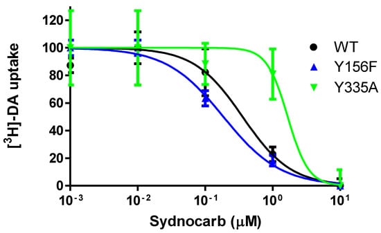Dose-response assay of sydnocarb against DAT mutants Y156F and Y335A versus WT-DAT. Nonlinear regression analysis of the normalized response gave sydnocarb IC50 as 0.439 ± 0.135, 0.262 ± 0.118, and 1.419 ± 0.201 µM in WT-DAT, Y156F-DAT, and Y335A-DAT-transfected COS-7 cells, respectively. Averages and SEM were calculated from three independent experiments.
