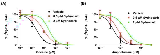Next, we examined the effects of sydnocarb on the dose-dependent cocaine and amphetamine inhibition of hDAT-mediated DA transport in DAT transfected COS-7 cells. We observed that the presence of sydnocarb dose-dependently decreased the potency of cocaine in the dose-response DA transport inhibition assays (Figure 7). The DAT inhibition potency of cocaine was 0.177 ± 0.034 µM in the absence of sydnocarb but significantly reduced to 1.38 ± 0.24 µM in the presence of 0.5-µM sydnocarb and to 8.40 ± 0.99 µM in the presence of 2.0-µM sydnocarb. Similar results were observed with sydnocarb’s influence on the amphetamine inhibition of the DA transport. The dose response of the amphetamine inhibition of DAT-mediated DA transport significantly shifted towards the right in the presence of 0.5-µM and 2.0-µM sydnocarb. The potency values of amphetamine in the absence and presence of 0.5-µM sydnocarb were 0.166 ± 0.020 µM and 0.642 ± 0.094 µM, respectively, and 2.60 ± 1.3 µM in the presence of 2.0-µM sydnocarb. Collectively, our results showed that sydnocarb dose-dependently modulates hDAT function in entirely novel ways, such that it alters the interaction of psychostimulants cocaine and amphetamine with hDAT and, hence, could have clinical relevance in treating psychostimulant use disorders.