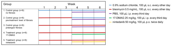 - The main treatment group was challenged with bleomycin for six weeks as described above. In the last three weeks of this six-week period, mice (n = 8) were treated intraperitoneally every third day with 100 μL of 17-DMAG (InvivoGen, San Diego, CA, USA) at a concentration of 25 mg/kg (5 mg/mL in PBS, Lonza) [26]. The dose of 17-DMAG used in this study had previously been shown to effectively inhibit Hsp90 in vivo [40], and to be well-tolerated in a chronic dose regimen of up to 180 days in vivo [41].