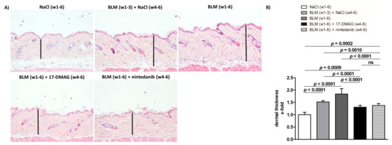 Treatment with 17-DMAG prevents further progression and may induce regression of dermal thickening induced by bleomycin. (A) Representative images of hematoxylin and eosin-stained skin sections are shown. Original magnification ×100. Vertical bars represent the dermal thickness. (B) Treatment with 17-DMAG prevents further progression and may induce regression of dermal thickening induced by bleomycin. The extent of the protective effects of 17-DMAG is comparable to the effect of the treatment with nintedanib. Columns represent the mean, and whiskers represent the standard error of the mean. w, week; NaCl, sodium chloride; BLM, bleomycin; 17-DMAG, 17-dimethylaminoethylamino-17-demethoxygeldanamycin (inhibitor of heat shock protein 90); ns, not significant (p ≥ 0.05); n = 8 mice in each group.