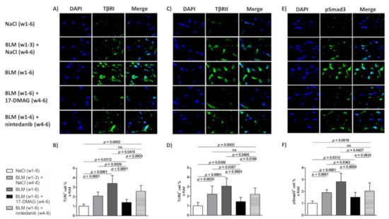Treatment with 17-DMAG inhibits the TGF-β/Smad signaling induced by bleomycin. Representative images of TβRI- (A), TβRII- (C), and phosphorylated Smad3 (pSmad3)-stained skin sections are shown (E). TβRI-, TβRII-, and pSmad3-positive cells are stained green, and nuclei are stained blue by DAPI. Original magnification ×400. Treatment with 17-DMAG decreased the accumulation of TβRI- (B), TβRII- (D), and pSmad3 (F) induced by bleomycin. Columns represent the mean and whiskers represent the standard error of the mean. w, week; NaCl, sodium chloride; BLM, bleomycin; 17-DMAG, 17-dimethylaminoethylamino-17-demethoxygeldanamycin (inhibitor of heat shock protein 90); TβRI, TGF-β receptor type I; TβRII, TGF-β receptor type II; ns, not significant (p ≥ 0.05); n = 8 mice in each group.