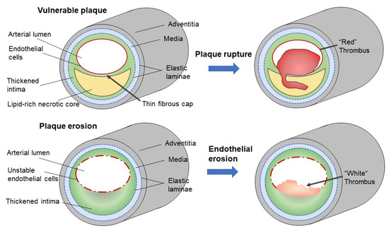 There are two types of atheromatous lesions that relate to these vascular events (Figure 1) [1]. Vulnerable plaques are atherosclerotic lesions containing large amounts of lipids and a number of lipid-accumulating foam cells that are covered with thin fibrous caps. Accumulation of macrophages and other types of leukocytes induce inflammatory responses and, eventually, the secretion of metalloproteinases, which could make the fibrous cap physically fragile; thus, such plaques have a high risk of being ruptured. Plaque ruptures induce acute thromboembolic responses containing blood components, which subsequently form red thrombi.