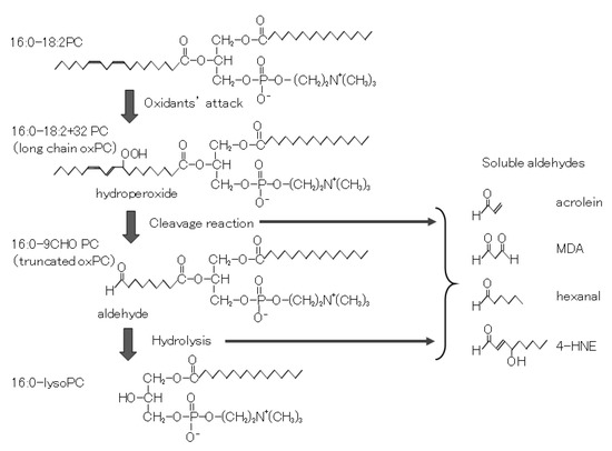 Among the constituents of LDL, hydrophobic lipids, cholesteryl ester, and TG are packed inside of the particle, and the hydrophobic core is surrounded by phospholipids, free cholesterol, and apoB. When LDL is oxidized in vitro, lipidomic analysis of oxLDL showed that PUFA-containing PC species are major targets of oxidation reaction [32,33,34]. PC species containing PUFA chains generate their hydroperoxide derivatives (PCOOH), which are subsequently converted into truncated PC products and small aldehyde fragments. Finally, the truncated PC is hydrolyzed to form lysoPC by either enzymatic or nonenzymatic pathways [32,33,34,35] (Figure 2). Cholesterol and TG are also oxidized to form various derivatives, such as oxidized fatty acids and 7-keto-cholesterol [36,37]. Reagents used for oxidation of LDL include copper sulfate, ferrous sulfate, and radical initiators such as 2,2′-azobis (2-amidinopropane) dihydro-chloride, lipoxygenase, or MPO. Oxidized products formed in LDL and modified by these oxidants partly overlap, but some products are selectively formed depending on the oxidants. For example, treatment of LDL with lipoxygenase produces mainly PCOOH, while incubation of LDL with a low concentration (e.g., mmol/L order) of copper sulfate produces several truncated oxPC and lysoPC [32]. During oxidative modification of lipoproteins, reactive aldehydes such as acrolein, malondialdehyde, and 4-hydroxynonenal bind to apolipoproteins to form various adducts at certain amino acid residues, mostly at lysine and histidine [23,24]. In addition, various amino acid residues, such as methionine and tryptophan, are oxygenated. MPO-dependent oxidation yields chlorinated or nitrated tyrosine residues in apoB protein together with oxidized lipids [38].