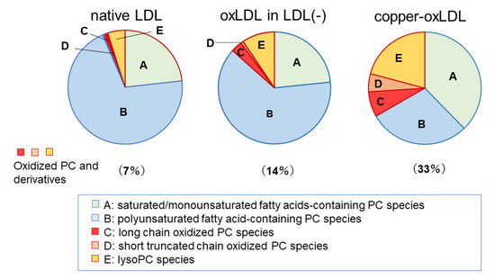 Composition of PCs in LDL, oxLDL recovered from LDL(−) fraction, and copper-induced oxidized LDL. The LDL(−) fraction was treated with anti-oxPC mAb to separate oxLDL from non-oxidized particles. PC molecular species were comprehensively analyzed by LC-MS/MS. More than 60 molecular species were classified into five groups: PC containing saturated and monounsaturated fatty acids (A), PUFA-containing PC (B), PC containing long chain oxidized fatty acids (C), oxPC containing truncated fatty acids (D), and lysoPC (E). The data are summarized from references [31,101].