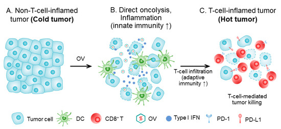 Many clinical studies have been conducted on OVs, and 119 papers have been reported based on 97 clinical studies on 3233 cancer patients over the last 20 years [3]. Since the approval of T-VEC for the treatment of advanced melanoma in 2015, the most exciting development is probably the combination of T-VEC with ICB for advanced melanoma, for which the overall response rate was up to 67% [4,5]. Most human cancers are quite cold and do not respond to ICB-type immunotherapy with good efficacy [6]. However, OVs can transform cold tumors to hot [7,8] (Figure 1). Thus, it may be one of most suitable agents for combination immunotherapy for cold cancers. Rational combination regimens involving OVs have a bright future in cancer immunotherapy [9,10].