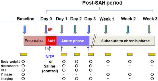 Thus, this study aimed to evaluate the “post-event” neuroprotective role of neurotropin in EBI after experimental SAH in mice. We used noninvasive multimodal methods using transcranial/cardiac color Doppler ultrasound and magnetic resonance imaging (MRI) (Figure S1A) that were successfully applied in the same murine model to evaluate the real-time hemodynamic effect of post-SAH EBI in our recent publication [18,19]. We hypothesized that if neurotropin was applied early after SAH, then it could act against EBI and may further provide better outcomes.