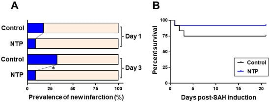 Effects of neurotropin on newly developed cerebral infarction (A) and the Kaplan–Meier survival curve (B) in mice after-SAH. * p < 0.05; Fisher’s extract test. NTP, neurotropin.