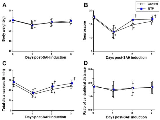 Time–course changes of the cardiorespiratory and cerebrovascular parameters in the acute phase after SAH induction in the control and neurotropin groups. Body weight (A). Neuroscore (B). Total distance (C) and ratio of the central/total distance (D) obtained in the open-field test. * p < 0.05 vs. baseline; † p < 0.05 vs. control; two-way ANOVA with a post hoc analysis (Bonferroni–Dunn’s test). NTP, neurotropin.