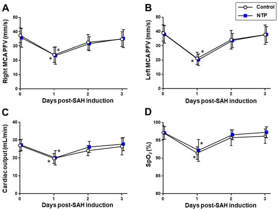 Time–course changes in the acute phase after SAH induction in the control and neurotropin groups. Peak systolic flow velocity (PFV) of the right (A) and left (B) middle cerebral arteries (MCA). Cardiac output (CO) (C). Oxygen saturation (SpO2) (D). * p < 0.05 vs. baseline; two-way ANOVA with a post hoc analysis (Bonferroni–Dunn’s test). NTP, neurotropin.