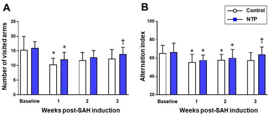 Time–course changes in the chronic phase after SAH induction in the control and neurotropin groups. Number of visited arms (A). Alternation index (B). * p < 0.05 vs. baseline; † p < 0.05 vs. control; two-way ANOVA with a post hoc analysis (Bonferroni–Dunn’s test). NTP, neurotropin.