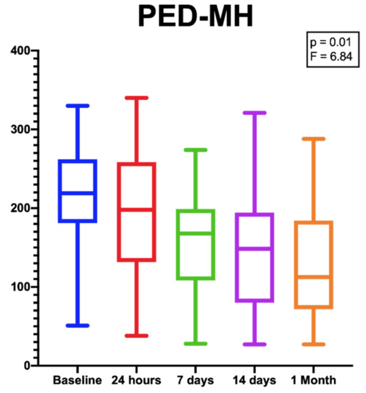 Box plots showing the significant reduction in PED-MHs from baseline to the end of the follow-up period. [p = 0.01; F (DF:1.31, 14.13) = 6.84.].