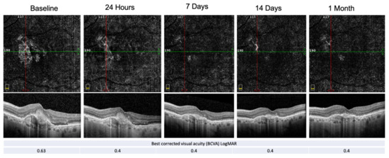 This study was conducted in agreement with the tenets of the Declaration of Helsinki for research involving human subjects, and was approved by Institutional Review Committees (ID number: 3680 approved on 19 January 2021). Written informed consent to participate in this observational study was obtained from all patients. Inclusion criteria were (1) a diagnosis of PED secondary to e-AMD, (2) having undergone a Brolucizumab (Beovu®, Novertis, Basel, Switzerland) injection, (3) the presence of high-quality structural spectral domain OCT (SD-OCT) and OCT-A images (i.e., signal strength index higher than 7/10) not affected by artifacts and (4) not being responsive (i.e., absence of any sign of exudation regression) to other intravitreal anti-VEGFs. Exclusion criteria were the concomitant presence of ophthalmological diseases potentially able to confound the interpretation of images (e.g., diabetic retinopathy, glaucoma, chorioretinal diseases), the lack of high-quality images and exudation regression following prior anti-VEGF treatments. All enrolled patients underwent a comprehensive ophthalmological evaluation. This included measurement of the BCVA using the early treatment diabetic retinopathy study (ETDRS) charts and the logarithm of the minimum angle of resolution (LogMAR) system, a dilated fundus examination and the performance of OCT and OCT-A scans. The latter was performed using the RTVue XR Avanti OCT-A system (AngioVue system, Optovue® Inc., Fremont, CA, USA). Imaging of the retinal lesions and analysis of the lesions’ development were repeated the day after the injection, and then 7, 14 and 30 days thereafter.