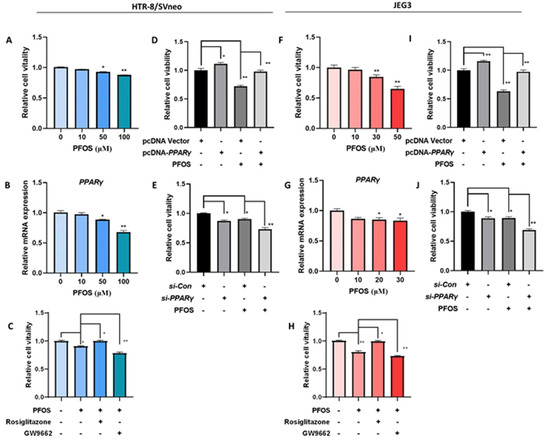 3.1. PPARγ Mediates PFOS-Induced Inhibition of Trophoblast Cells Survival and Proliferation In Vitro