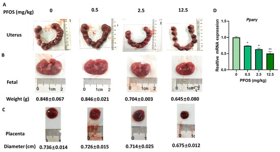 3.8. PFOS Alters PPARγ Target Genes mRNA Expression in Mice Placenta